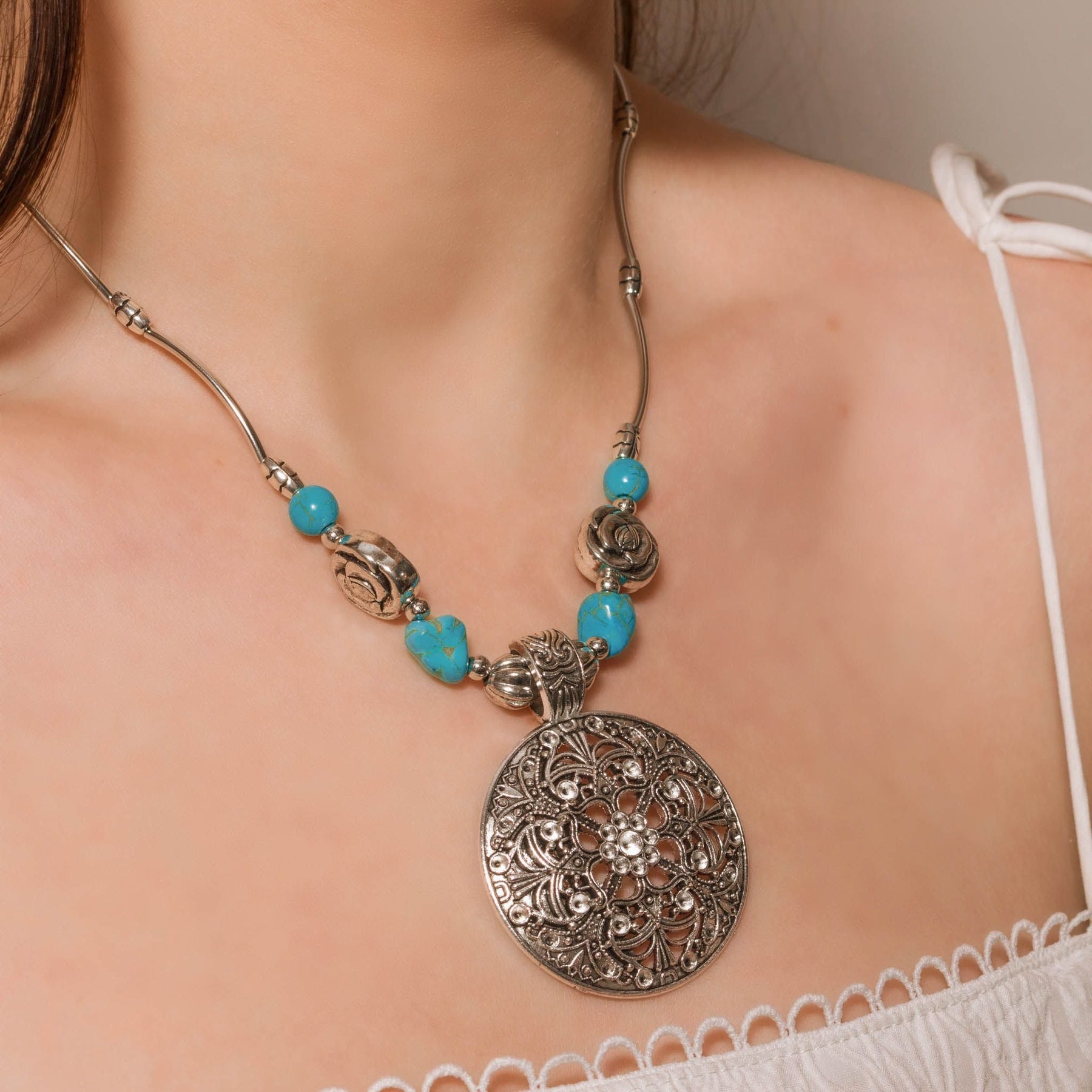 This captivating necklace features a beautifully crafted round medallion pendant with floral motifs, paired with turquoise beads and delicate rose accents. Its balanced combination of ornate detail and rustic elegance makes it a timeless accessory, perfect for elevating your daily outfits or enhancing your bohemian-inspired looks.