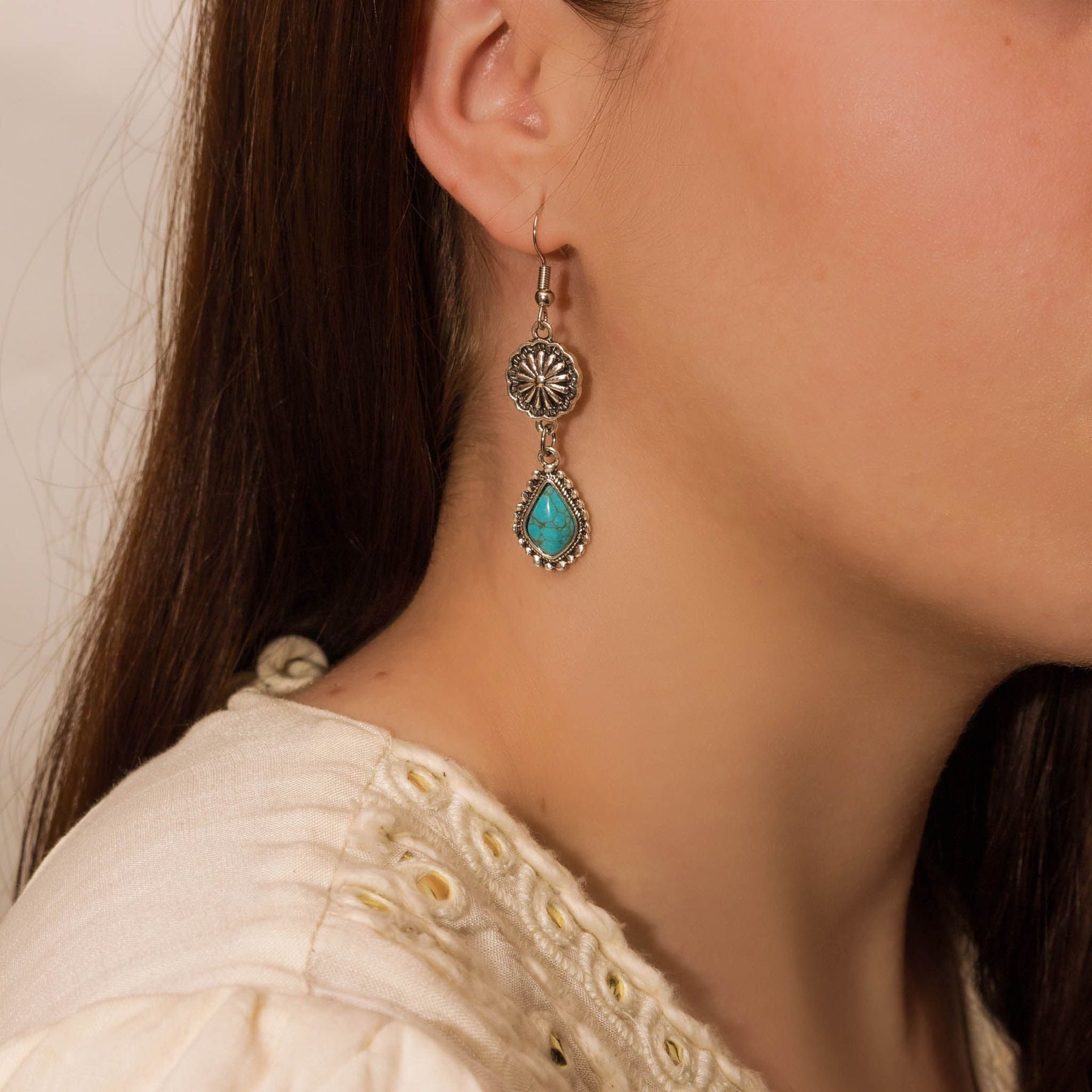 Crafted in a romantic antique silver-tone, these bohemian teardrop earrings bring the perfect touch of free-spirited elegance to your look. The top features a vintage flower motif, beautifully detailed with aged texture, while the dangling turquoise-style teardrop adds a bold, earthy accent. Designed to sway gently as you move, they echo the beauty of handcrafted pieces—without the weight or formality.