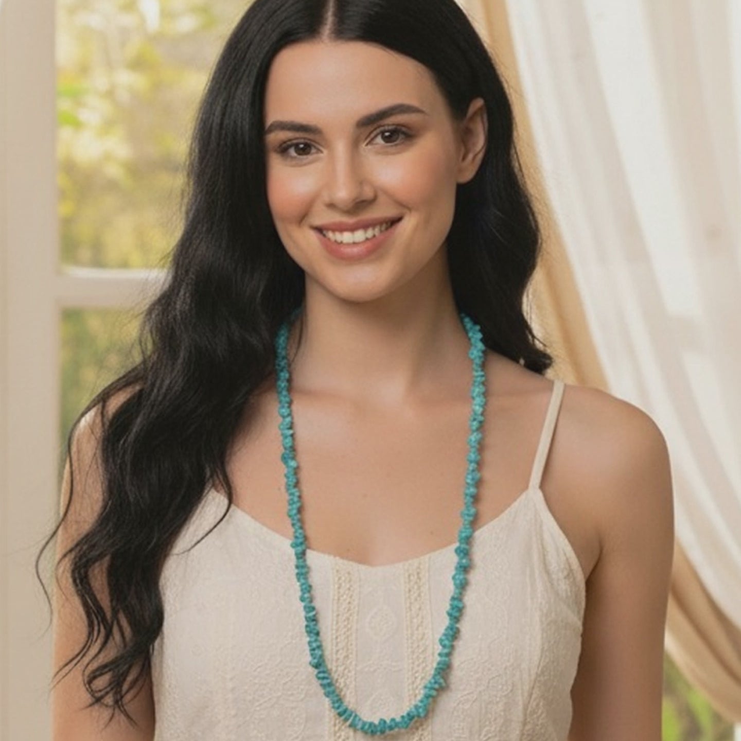 This vivid turquoise chip necklace brings the wild spirit of desert landscapes to life. Each stone is naturally shaped and polished to highlight its unique character, strung together in a continuous flow of cool, blue energy. Its earthy beauty makes it a striking statement piece while staying effortlessly wearable.