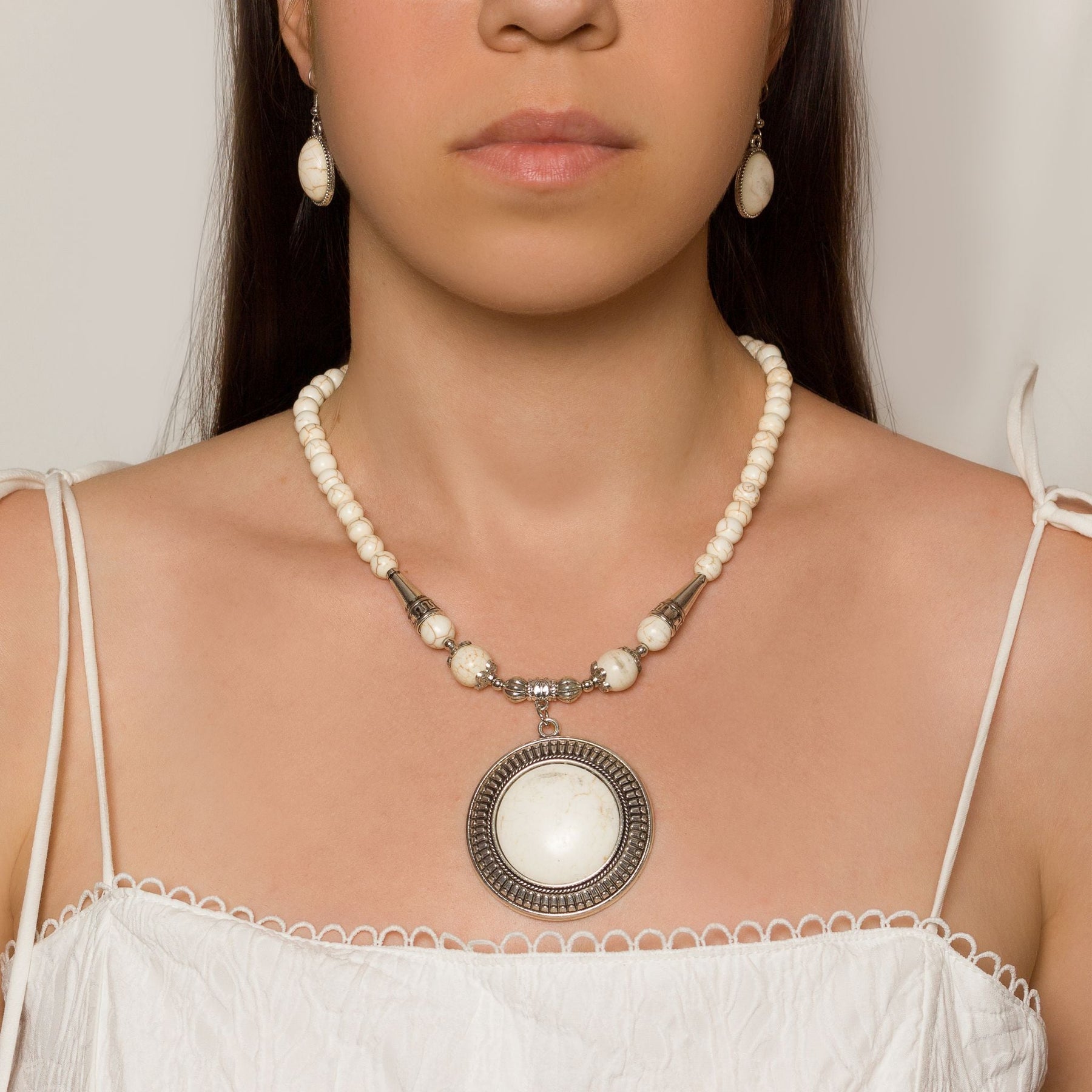 This matching jewelry set features a round ivory-tone stone with a natural marbled finish, framed by intricate silver-tone detailing. The necklace pairs polished ivory beads with decorative metal accents, while the matching drop earrings mirror the pendant’s bold yet refined design. A versatile piece that transitions effortlessly from casual to dressy occasions.