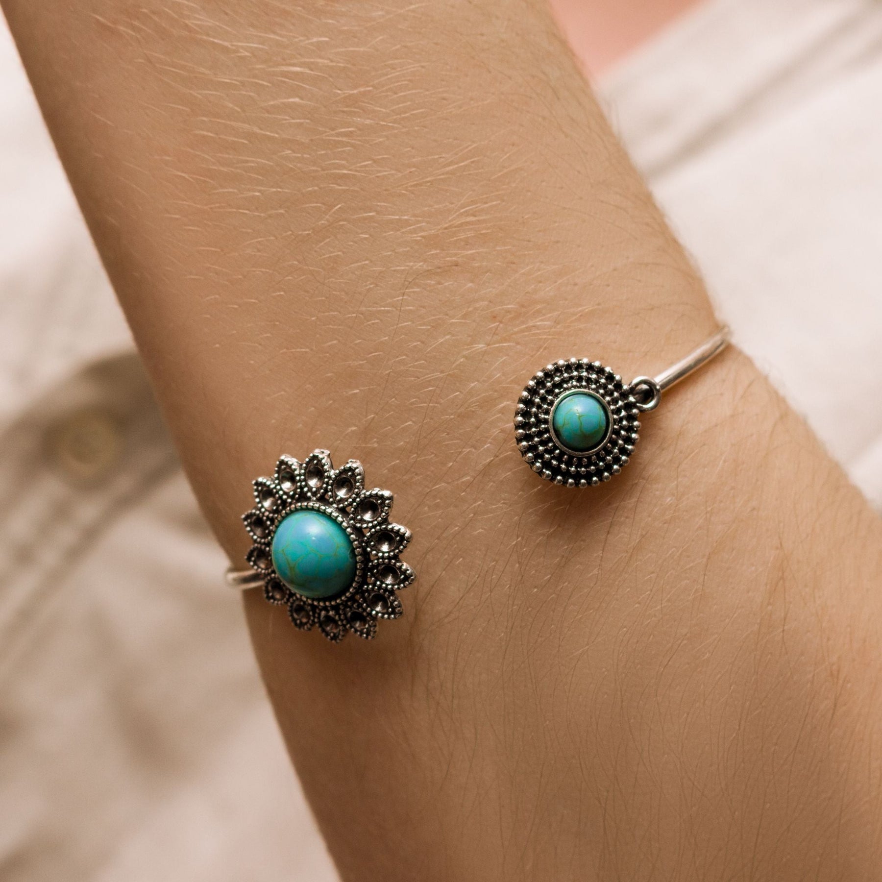 • Adjustable open cuff design for an easy fit • Inner diameter: 2.52 in • Flower motif centerpiece with turquoise-style stone • Lightweight, comfortable, and beautifully detailed