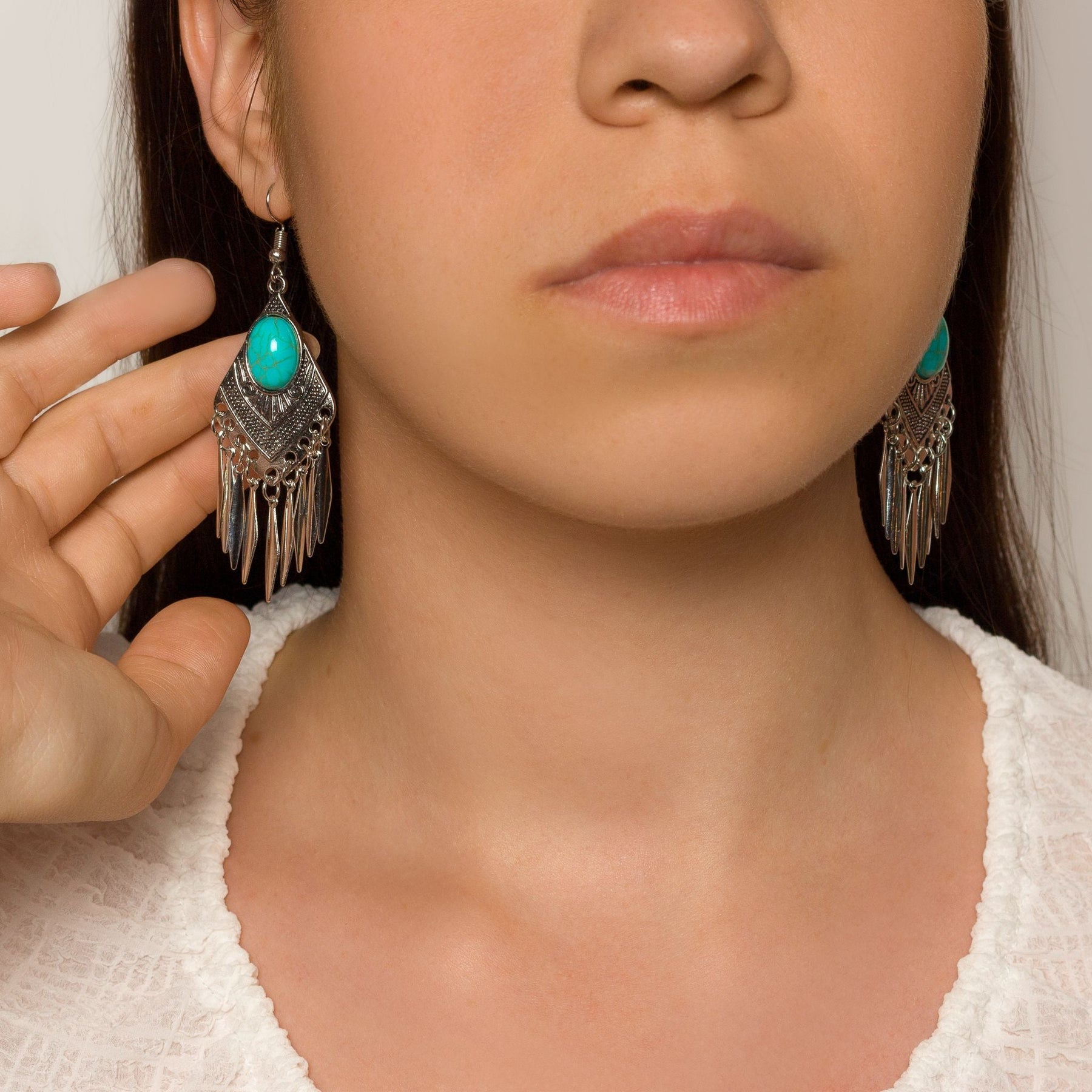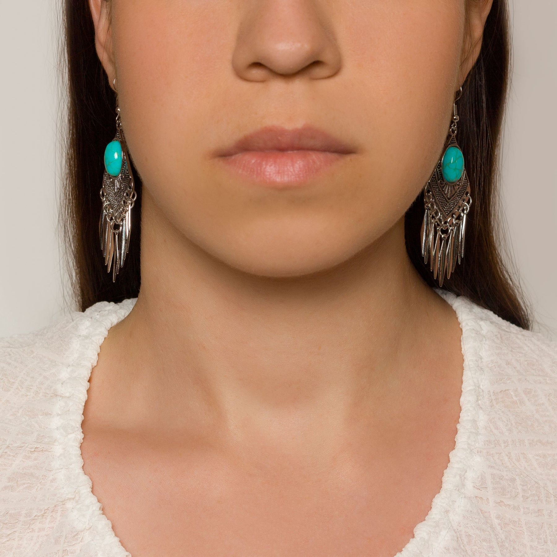 These silver-tone drop earrings feature a radiant turquoise stone framed in intricate engraved detail, with cascading fringe that sways gently as you move. The combination of cool silver-tone and vibrant turquoise evokes the spirit of the Southwest—bold, timeless, and full of wanderlust.